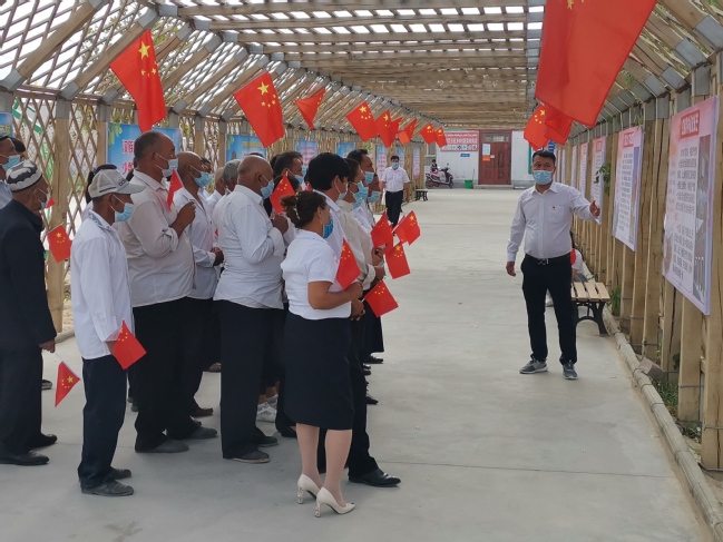 在阔什吐格曼村,党总支组织党员干部和实习学生观看庆祝大会盛况后,全体党员重温了入党誓词,老党员们为新党员佩戴了党员徽章,大家还一同参观了民族团结文化长廊,重温了百年党史和一代又一代中国共产党人顽强拼搏、不懈奋斗的历史事迹,汲取奋进力量。