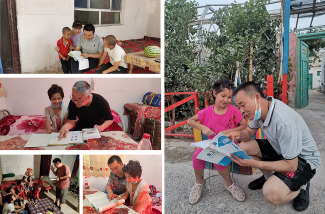 “三讲”送学习。讲“七一”讲话精神,增强前行动力。图书馆党总支书记马晓利紧密围绕习近平总书记在庆祝中国共产党成立100周年大会上的重要讲话精神,向其亲戚塔力普·阿尤普一家开展学习体会宣讲,一起回望新中国从站起来、富起来到强起来的伟大变化,一起感受近些年自己、家庭和家乡发生的天翻地覆的变化,一件件、一桩桩真实发生的巨变使塔力普·阿尤普感同身受,他激动地说:“共产党‘亚克西’,带领我们全家摆脱了贫困,我们要时刻感党恩、跟党走,用勤劳的双手过更幸福的日子。” 讲党史,展示“中国共产党人的精神谱系”。人事处副处长莎依达·伊力亚斯利用周一“三结合”契机,借助宣传展板,向村民讲解“中国共产党人的精神谱系”,解读中国共产党的为民思想,收获聆听群众的热烈掌声。其余结亲干部坚持将习近平总书记在庆祝中国共产党成立100周年大会上的重要讲话精神,用包谷馕式的语言,紧贴干部个人和村民实际,在茶余饭后、田间地头开展讲党史故事、讲话精神解读、心得感悟分享等主题宣讲活动80余场,鼓励亲戚用习近平新时代中国特色社会主义思想武装头脑,积极增产增收,在乡村振兴的伟大征程中阔步前行,为建设美好家园贡献自己的一份力量。讲中华优秀传统文化,铸牢中华民族共同体意识。审计处处长徐宇生,离退休管理服务中心党委副书记、纪委书记张明来等同志利用晚饭闲暇时间给孩子们辅导作业、上国语课、推广普通话、教唐诗宋词,让孩子们感受中华优秀传统文化的魅力,认识到祖国的伟大复兴离不开各族人民的共同努力。