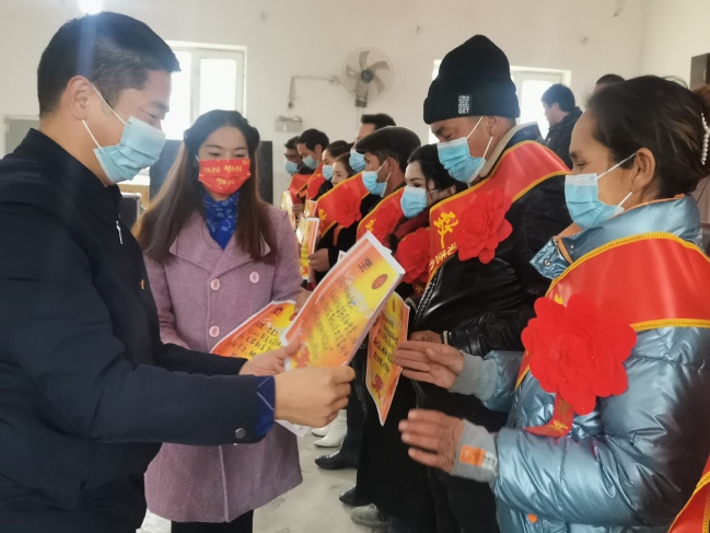 村党支部副书记阿扎提古丽·赛皮丁宣读了《关于表彰亚喀艾日克村党总支2021年先进个人的决定》,大会对图如普·麦麦提等50人(家庭)进行了表彰和颁奖。