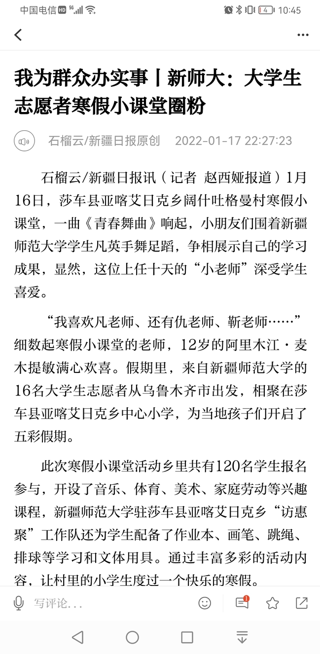 “我喜欢凡老师、还有仇老师、靳老师……”细数起寒假小课堂的老师,12岁的阿里木江·麦木提敏满心欢喜。假期里,来自88858cc永利官网的16名大学生志愿者从乌鲁木齐市出发,相聚在莎车县亚喀艾日克乡中心小学,为当地孩子们开启了五彩假期。