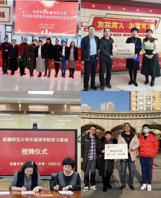签约前,外国语学院班子及系部主任分组前往乌鲁木齐市第七十中学、第四十一中学、第十二中学以及石河子市第二中学进行交流座谈,共同围绕实习基地建设、中学英语教学质量改进项目、教师专业发展支持等方面的深度合作进行探讨,并在现场举行了签约授牌仪式。