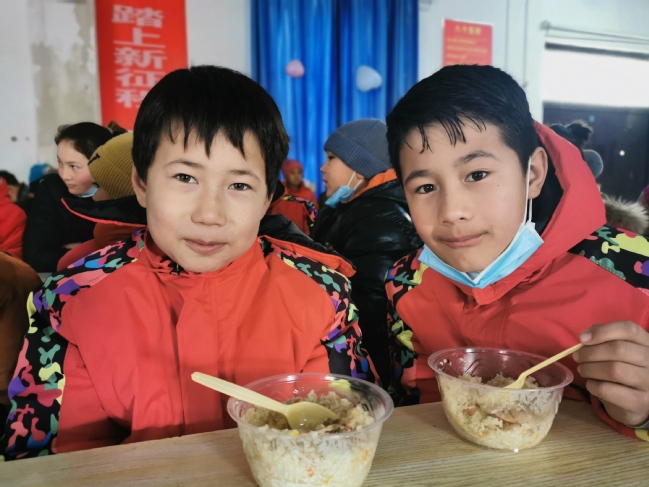 亚喀艾日克村春节联欢活动中孩子们品尝美食