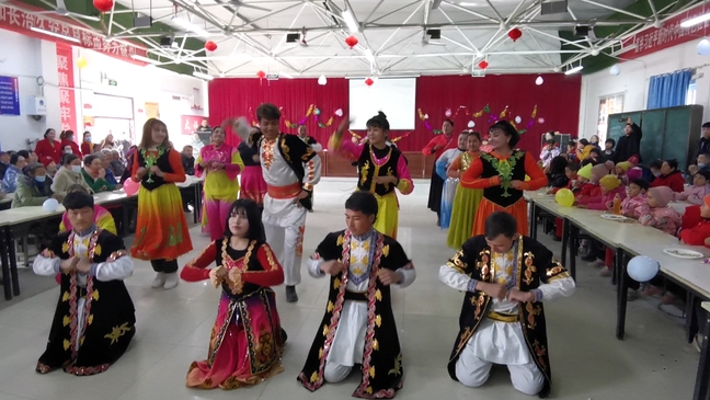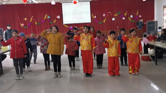 亚喀艾日克村春节联欢活动中孩子们表演儿童手势舞《童心向党》
