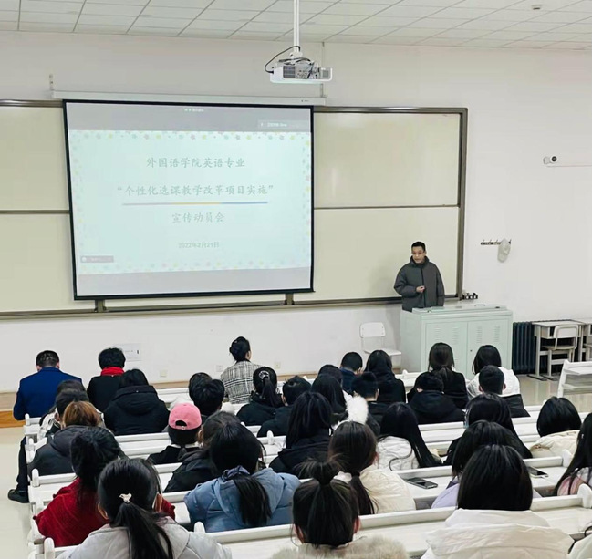 动员会上,伊力米热·伊力亚斯介绍了教学改革实施的背景意义,承担2021级英语专业《综合英语》《英语口语》《英语听力》《英语泛读》《英语写作》《英语语法》课程的授课教师从课程目标与内容、教学模式与方法、考核与评价等方面介绍课程定位与特色。学生经过2周试听课后,结合真实体验与需求自主选择课程教学班级。