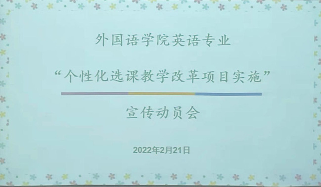 为进一步加强外国语学院英语专业建设,推进师范专业认证工作,提升人才培养质量,经过学院党委、党政联席会、校内外学科专家多轮论证,外国语学院自2022年春季学期面向2021级英语专业本科生实施个性化选课教学改革实践,2月21日下午,外国语学院组织召开教学改革实施动员会,特邀苏州大学外语教育与教师发展研究所副所长古海波博士、学校教务处副处长毋兆鹏博士参加。学院领导班子、系部主任、2021级英语专业任课教师与学业班主任及英语专业2021级全体本科生参加会议,副院长伊力米热·伊力亚斯主持。