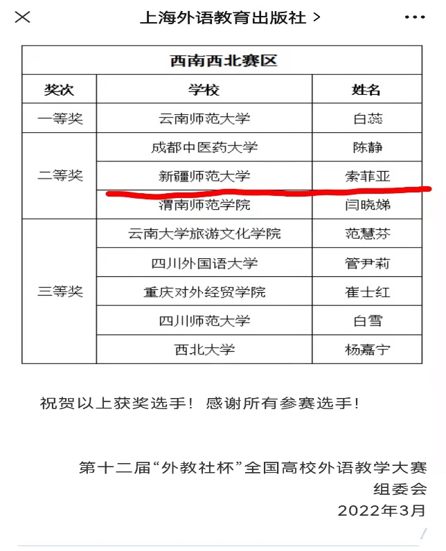 3月10日,第十二届“外教社杯”全国高校外语教学大赛日语专业组分赛区获奖名单公布,永利官网外国语学院教师索菲娅·范的参赛作品经评审获得西南西北赛区二等奖。