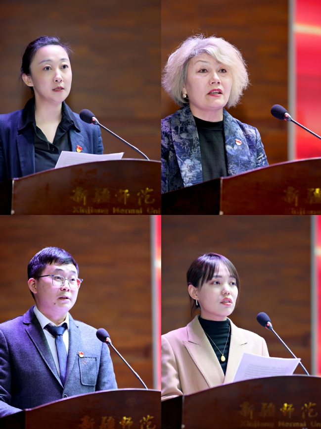 外国语学院党委书记刘蓉、预科教育学院教师第三党支部书记吐尔逊娜依·马合木提、教育科学学院本科生第三党支部书记林拱鑫、美术学院研究生第二党支部书记胡嘉鑫作为党组织书记代表分别就加强党建与业务融合、支部对标争先等主题作了交流发言。