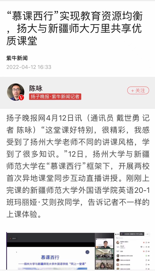 “这次直播讲授,是华东地区首次外语类专业参与‘慕课西行’项目。”扬大教务处处长王承堂介绍,本次参与“慕课西行”的英语(师范)专业,已通过教育部二级师范专业认证。异地课堂直播探索,既是扬大教育部虚拟教研室建设的一部分,也是获教育部立项的“涉外复合型人才协同培养创新与实践”项目的一部分。据悉,88858cc永利官网教务处处长孟繁胜,感谢扬州大学的智力支持,希望两校以此为契机,加强校际合作,继续开展多形式的教学教研活动。