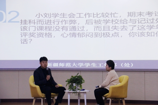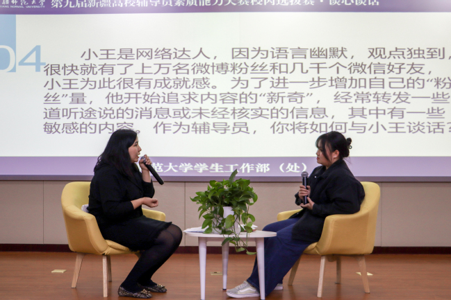 本次比赛分为案例研讨和谈心谈话两个环节。在案例研讨环节,选手通过抽签分组,以“我提问,你回答”的方式围绕案例共同辨析原因、研讨对策,展示了辅导员分析问题、研判问题、解决问题、应急处突等能力。谈心谈话环节考验了辅导员对学生特征、学生成长成才规律的了解和把握程度,对学生的教育引导能力、解决理论困惑和实际问题的能力等,参赛辅导员和助演学生以情景再现的方式开展谈话,找出症结,化解矛盾,提供建议。