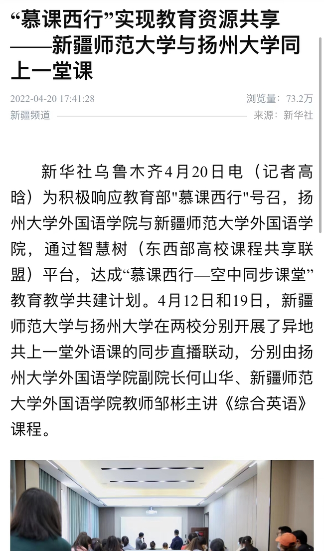 新华社乌鲁木齐4月20日电(记者高晗) 为积极响应教育部慕课西行号召,扬州大学外国语学院与88858cc永利官网外国语学院,通过智慧树(东西部高校课程共享联盟)平台,达成“慕课西行—空中同步课堂”教育教学共建计划。4月12日和19日,88858cc永利官网与扬州大学在两校分别开展了异地共上一堂外语课的同步直播联动,分别由扬州大学外国语学院副院长何山华、88858cc永利官网外国语学院教师邹彬主讲《综合英语》课程。