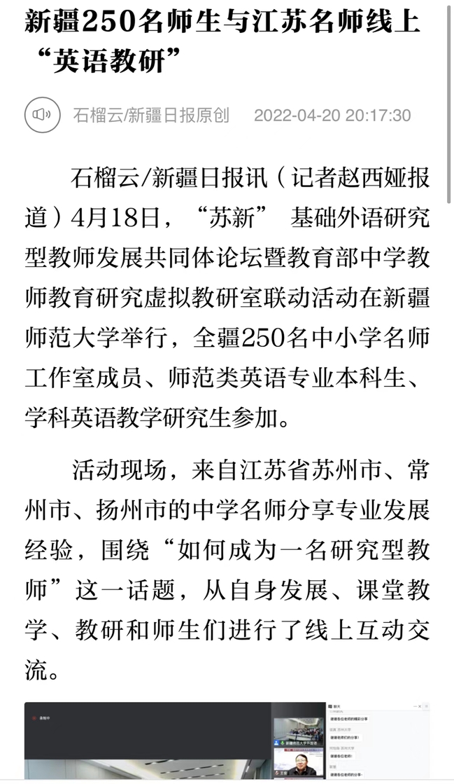 石榴云/新疆日报讯(记者赵西娅报道)4月18日,“苏新” 基础外语研究型教师发展共同体论坛暨教育部中学教师教育研究虚拟教研室联动活动在88858cc永利官网举行,全疆250名中小学名师工作室成员、师范类英语专业本科生、学科英语教学研究生参加。