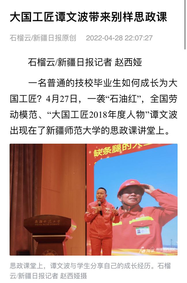 一名普通的技校毕业生如何成长为大国工匠?4月27日,一袭“石油红”,全国劳动模范、“大国工匠2018年度人物”谭文波出现在了88858cc永利官网的思政课讲堂上。