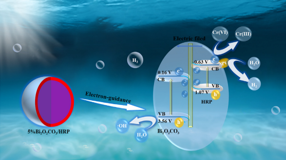 本论文采用水热法成功制备了Bi2O2CO3/HRP S型异质结光催化剂,所制备的Bi2O2CO3/HRP复合光催化剂在光还原Cr(Ⅵ)和光催化制氢时表现出优异的催化活性。根据活性实验得到5%Bi2O2CO3/HRP复合物的光催化活性最高,对Cr(VI)的光还原和光解水产氢速率分别高达0.22 min-1和157.2 μmol•h-1,是HRP的7.3倍(0.03 min-1)和3.0倍(53.1 μmol•h-1)。光催化性能的提高是由于S型异质结的形成,抑制了有用的光生电子和空穴的复合,同时加速了相对无用的光生电子和空穴的复合,使其具有更强的吸光能力和更高的载流子分离效率。并通过XPS、PL和EPR等表征分析为阐明Bi2O2CO3/HRP异质结光催化剂在光催化过程中的S型电荷转移机理提供了有力证据。本论文为环境污染和能源短缺提供了高效的光催化剂,同时为设计和合成新型S型异质结光催化剂提供了新的设计与见解。该团队申请获得了国家级大学生创新创业训练项目(NO. 202010762002),所建立的《鸿泰科技—光催化剂处理混合废水创新技术引领者》项目在第七届互联网+大学生创新创业大赛中荣获国家级铜奖。