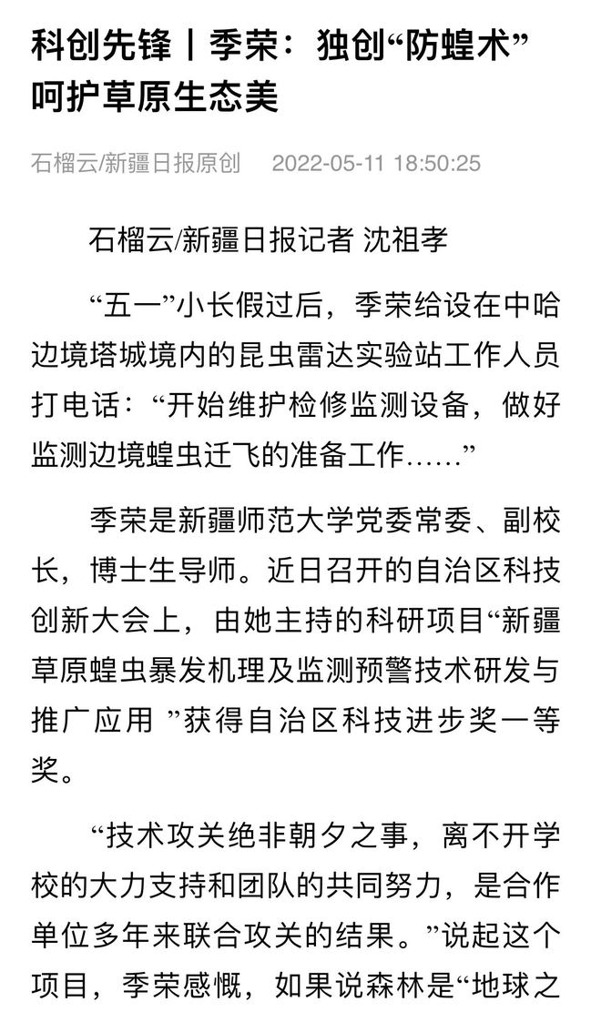 如今的季荣已成为自治区草原蝗虫防治的中坚力量。她和团队首次提出的“中亚昆虫迁飞场”,填补了中亚区域昆虫迁飞研究领域的空白;首次研发的双模式昆虫探测雷达技术,攻克了国际上单模式昆虫雷达探测的技术瓶颈;首次集成创新了新疆草原蝗虫监测预警服务系统,实现了科技成果在草原牧区的转移转化,做到了蝗灾早发现、早预警、早防治……这些科研成果的技术运用对促进我区农牧业发展、提高农牧民生活水平与生存质量、保护生态屏障作出了重要贡献。