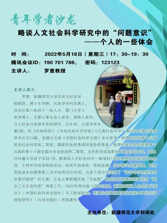 5月18日下午,永利官网科研处以腾讯会议形式举办了2022年第一期青年学者沙龙。邀请永利官网历史与社会学院教授罗意做了题为《略谈人文社会科学研究中的“问题意识”——个人的一些体会》学术讲座,讲座由科研处副处长苏闻宇主持,一百余名校内外师生在线参与。