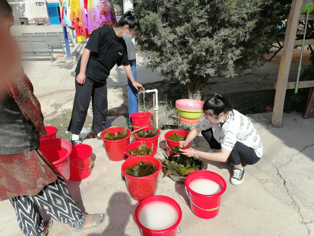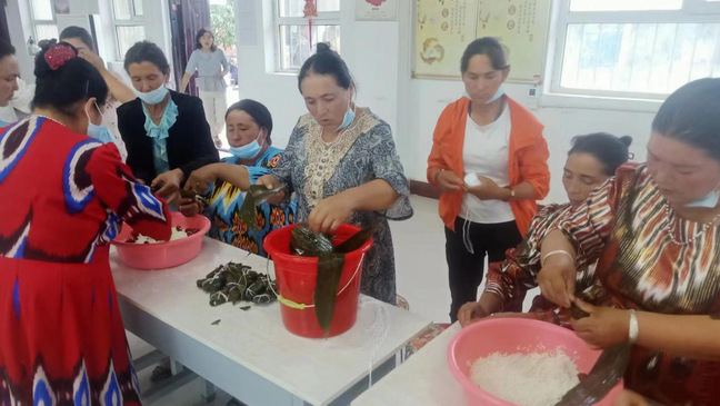 活动开始时,工作队员阿满古丽老师首先向村民介绍了端午节的由来习俗及蕴含的爱国主义情怀。随后,在实习学生王媛媛的指导下,大家在说笑中体验着包粽子的快乐。经过大家的共同努力,两桶糯米变成了一个个粽子。村民们吃着自己包的粽子,伴着欢快的音乐、跳起了麦西来甫。他们纷纷表示,以这样的方式过传统佳节,让大家感受到了浓浓的节日气氛,了解了端午节的来历习俗,学会了包粽子,很开心。