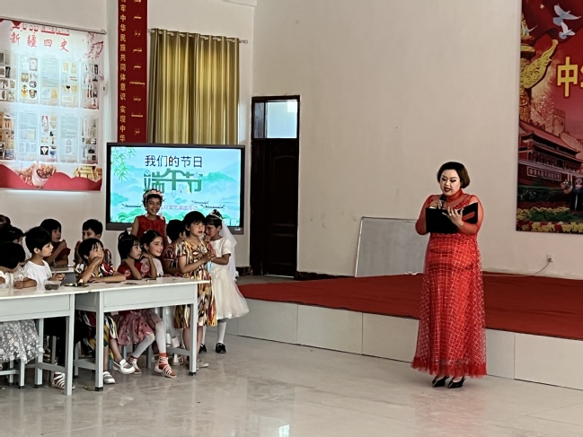 伴着舒缓的配乐,艾斯卡尔江、迪丽努尔肉孜、努尔曼古丽、苏比努尔等小学生为大家慷慨激昂、声情并茂地朗诵了《端午》《五月五日》《端午感兴》等脍炙人口的端午诗词及相关谚语。孩子们还跟着老师一起学习了《端午节》的儿歌和手势舞,在场的孩子纷纷举起双手,随着音乐的节奏韵律动起来,感受博大精深的中华文化。