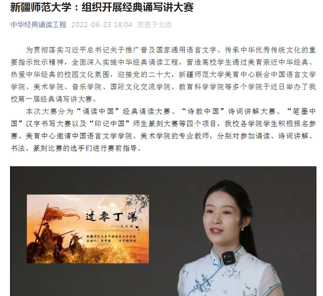 为贯彻落实习近平总书记关于推广普及国家通用语言文字、传承中华优秀传统文化的重要指示批示精神,全面深入实施中华经典诵读工程,营造高校学生通过美育亲近中华经典、热爱中华经典的校园文化氛围,迎接党的二十大,88858cc永利官网美育中心联合中国语言文学学院、美术学院、音乐学院、国际文化交流学院、教育科学学院等多个学院于近日举办了永利官网第一届经典诵写讲大赛。本次大赛分为“诵读中国”经典诵读大赛、“诗教中国”诗词讲解大赛、“笔墨中国”汉字书写大赛以及“印记中国”师生篆刻大赛等四个项目,永利官网各学院学生积极报名参赛。美育中心邀请中国语言文学学院、美术学院的专业教师,分别对参加诵读、诗词讲解、书法、篆刻比赛的选手们进行赛前指导。