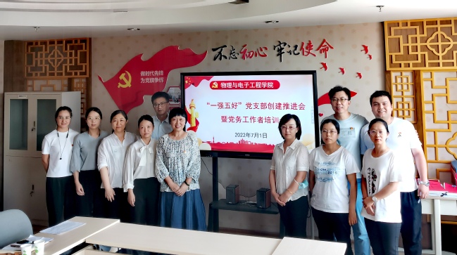 为深入贯彻新时代高校党建工作要求,认真落实《88858cc永利官网高质量推进基层党建2020-2025行动计划》,不断提升物理与电子工程学院党务工作者的政治素质和业务能力,7月1日,物理与电子工程学院党委召开“一强五好”党支部创建推进会暨党务工作者培训会。邀请校党委组织部综合科科长高丽倩进行“党的组织生活与党员发展”专题培训。会议由物理与电子工程学院党委副书记、纪委书记买星主持,党委书记李莉和全体党支部委员参加。