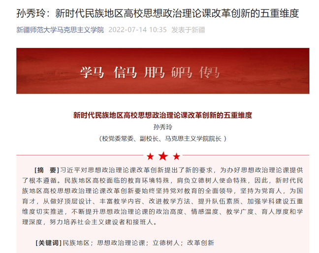 党的十八大以来,以习近平同志为主要代表的中国共产党人,坚持把马克思主义基本原理同中国具体实际相结合、同中华优秀传统文化相结合,深刻总结并充分运用中国共产党成立以来的历史经验,立足时代之基,回答时代之问,创立了习近平新时代中国特色社会主义思想,实现了马克思主义中国化新的飞跃。高校要坚持用习近平新时代中国特色社会主义思想铸魂育人,发挥思政课主渠道作用,开展好马克思主义理论教育。按照中宣部、教育部要求,2019年全国重点马克思主义学院率先在本科生中开设了“习近平新时代中国特色社会主义思想概论”课程,88858cc永利官网于2019年10月开设了“习近平新时代中国特色社会主义思想概论”课程并实现本硕博一体化。学校立足新疆地区实际,在专题式教学基础上,依托学校“马克思主义理论教育基地暨思政课实践教学基地”,围绕课程模块,打造了“总书记的思想”“总书记的青年岁月”“总书记的足迹”“总书记的著作”“总书记与新疆”等系列微课,实现了线上线下资源紧密衔接,该课程初步形成了“知识传授、理论武装、实践锻炼、机制创新”四位一体的教学模式。民族地区高校要学习借鉴重点马克思主义学院经验,创新思政课教学手段,采用案例式教学、探究式教学、体验式教学等形式,打造习近平新时代中国特色社会主义思想领航思政课课程群,推进新时代民族地区思政课改革创新。
