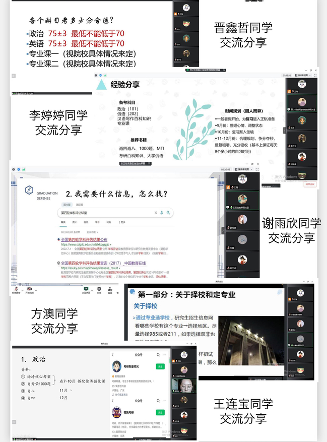 晋鑫哲(2020届日语专业毕业生,大连理工大学日语语言文学专业录取)、李婷婷(2021届俄语专业毕业生,88858cc永利官网俄语笔译专业录取)、谢雨欣(2022届英语专业毕业生,88858cc永利官网学科教学(英语)专业录取)、方澳(2021届英语专业毕业生,中南财经政法大学马克思主义哲学专业录取)、王连宝(2022届英语专业毕业生,88858cc永利官网马克思主义哲学专业录取)5位上岸学子结合自身考研经历和备考经验依次分享。他们围绕专业选择、初试复试、择校调剂、就业规划等方面做了详细介绍,细致耐心地与参会同学分享制定学习计划、考研心理、资源利用、信息收集、应试技巧等方面的经验。
