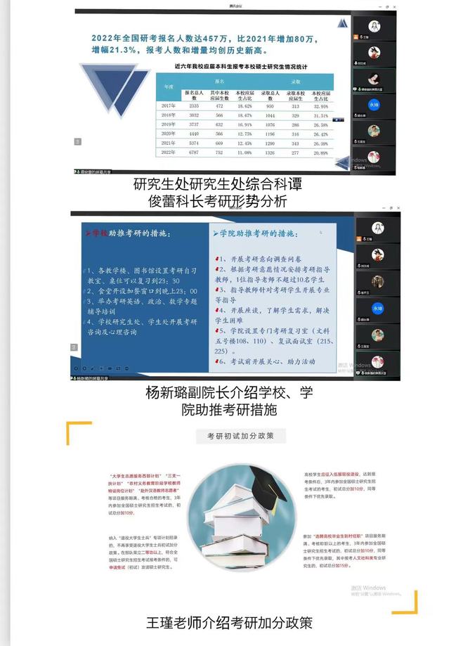 会上,谭俊蕾分析永利官网近6年应届本科生报考硕士研究生情况统计,并从报考流程及注意事项、专项计划解读等方面为毕业生提供信息指导;杨新璐从近年的招生录取、专业复习、考录注意事项及学校与学院助推考研的系列措施进行介绍;王瑾介绍了近3年毕业生报考研究生与录取情况。