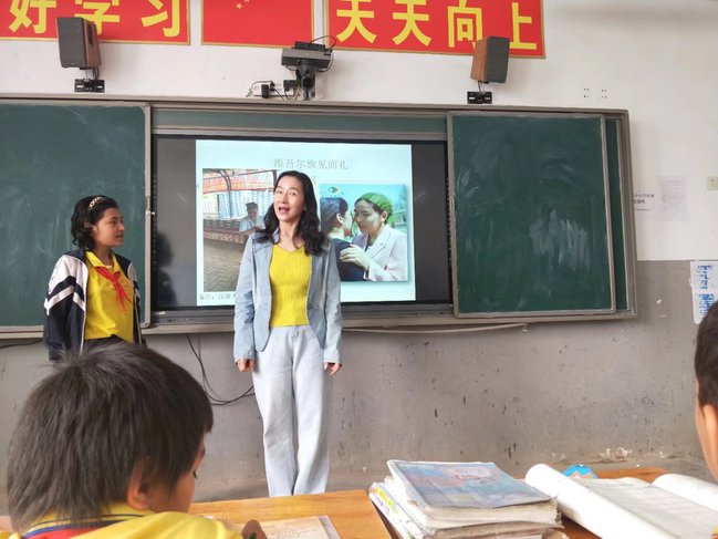 此前,在学校驻莎车县前方党工委的指导下,附属中学派往亚喀艾日克乡中心小学授课的张莉莉、陈敏秀两位骨干教师与亚喀艾日克乡中心小学的师生一起,按活动方案,精心准备服装道具、进行节目编排、撰写小讲解员稿件、写书信、学唱《手牵手》歌曲、绘制同一幅画、录制视频等。
