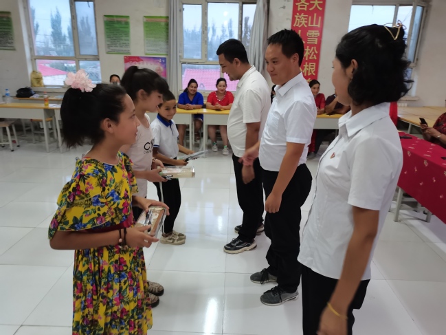 8月1日晚,各村开展了“小课堂”活动成果汇报,小学生们进行了暑假作业、古诗词朗诵、美术作品、体育活动、音乐手势舞串烧等形式的展示汇报,向乡党委领导、村干部以及家长们汇报了自己的学习收获,前方党工委为活动期间表现突出的小学生准备了小奖品。汇报会上,亚喀艾日克乡党委副书记、政法书记张同振代表乡政府向学校赠送锦旗。活动结束时,大学生志愿者进行了“小课堂”活动的总结,并向小学生们布置了暑假期间的学习任务,引导他们继续坚持规律作息,锻炼身体,培养广泛兴趣、分担家务劳动,用实际行动,回报家人、回报祖国。