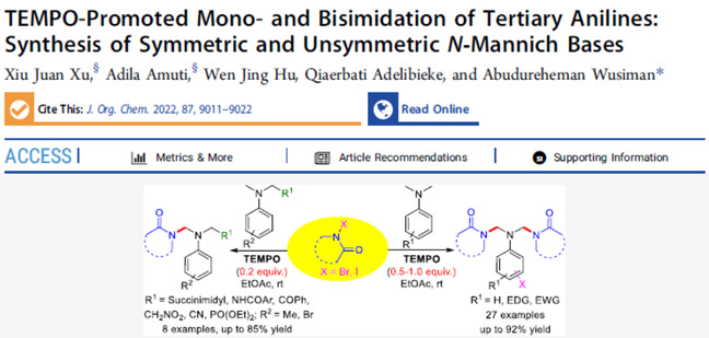 近期,永利官网化学化工学院阿不都热合曼·乌斯曼教授团队在美国化学会(ACS)有机化学领域权威杂志《The Journal of Organic Chemistry》发表题为“TEMPO-Promoted Mono- and Bisimidation of Tertiary Anilines: Synthesis of Symmetric and Unsymmetric N‑Mannich Bases”的研究论文,( IF = 4.198)。该论文以永利官网化学化工学院研究生徐秀娟和阿迪拉·阿木提为共同第一作者,阿不都热合曼·乌斯曼为通讯作者。受到国家自然科学基金(21762044)、新疆维吾尔自治区自然科学基金(2021D01A115)等项目的资助。