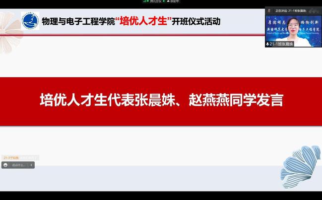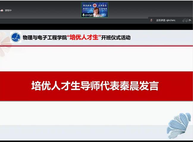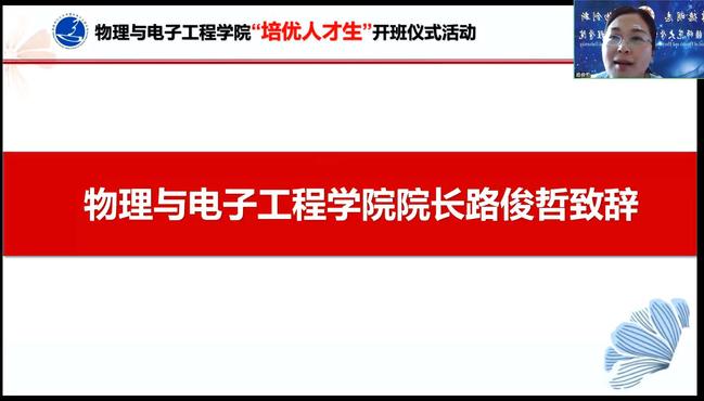 党委副书记、院长路俊哲在开班仪式上致辞。她首先对入选学院首批“培优人才计划”、成为学院个性化人才培养队伍中的40名同学表示了热烈的祝贺。她说,“卓拔培优计划”的试点是永利官网教育教学改革的重要举措,其实施将为永利官网人才培养质量的提升奠定重要基础。物理与电子工程学院培优班将实施“专家名师领军、教研组负责”的小班化、研究性虚拟班教学,进入培优班后,将给予学生更加自由的选择、宽松的时间自主安排和个性化的培养。专业课程有专门教师指导,主干考研课程实施小班化持续性指导,同时配备教学经验丰富的教学名师、专家教授和青年骨干进行授课,注重启发式、研讨式和探究式教学。在科研引导上配备一对一导师进行指引,全方位培养一批“基础厚、视野宽、能力强、素质高”的优秀人才。路俊哲希望进入培优班的同学秉承‘博学笃行,为人师表’的校训,努力成长为热爱专业、喜欢钻研,爱学习、会学习的优秀人才。学业导师和科研导师能以高度的责任感、扎实的学识、深厚的育人情怀担任好培优班级学生的领路人,不断更新教学方法、优化教学内容、创新教学手段,在学生学业成绩提高、科研能力增进、综合素养提升和创新技能增强等方面发挥好引领和指导作用。