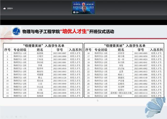 活动中,物理系系主任帕尔哈提江·吐尔孙教授从培养思路、培养目标、选拔条件及遴选程序、实施细则、考核指标、配套保障等六个方面介绍了培优人才生培养方案。党委副书记、纪委书记买星宣读了入选培优人才生名单,按照“思想品德高尚、专业素养深厚、学科基础扎实、创新能力优异、终身学习理念牢固、自我发展能力过硬”的标准,首批培优人才生共有40名学生入选,其中悟理菁英班30名、智电菁英班10名。