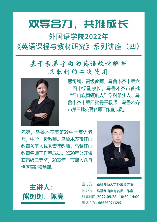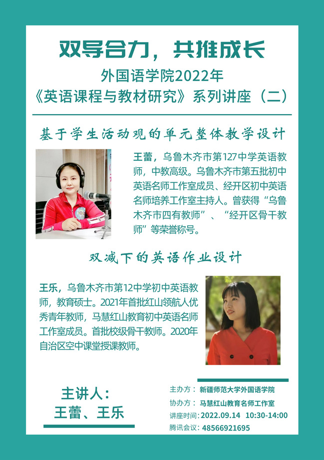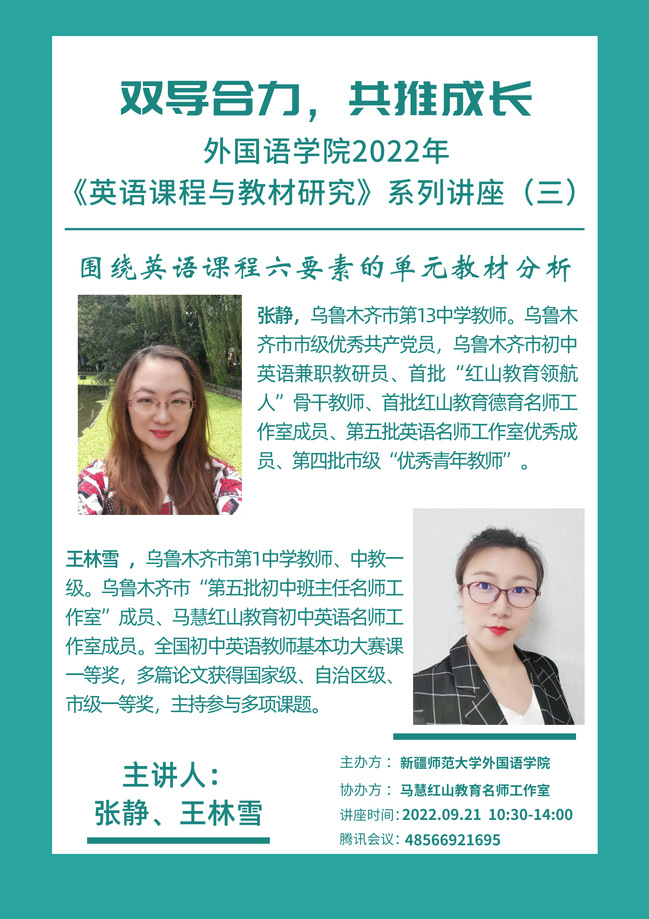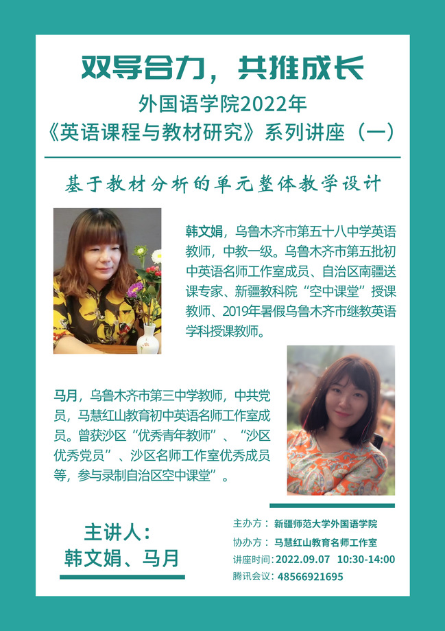 为深化高校与中小学协同育人,助力学科教学(英语)研究生教育教学实践与研究水平提升,提高研究生培养质量,外国语学院联合乌鲁木齐市马慧红山教育名师工作室于9月7日至28日期间举办《英语课程与教材研究》系列讲座,围绕单元整体教学设计、作业设计和教材使用等方面为2022级学科教学(英语)研究生开展系列讲座。