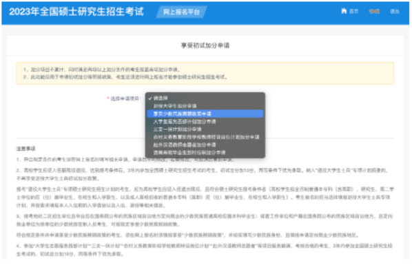 符合初试加分政策规定条件并申请享受初试加分政策的考生,应在完成报名信息填报后在“享受初试加分申请”模块(网上报名首页中部)提交申请,相关部门审核通过后考生可享受相应政策。报名期间可取消或修改相关申请。