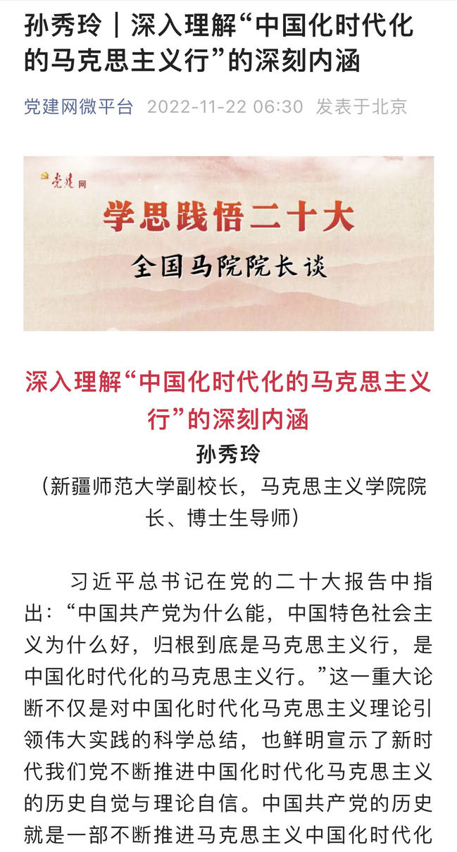 习近平总书记在党的二十大报告中指出:“中国共产党为什么能,中国特色社会主义为什么好,归根到底是马克思主义行,是中国化时代化的马克思主义行。”这一重大论断不仅是对中国化时代化马克思主义理论引领伟大实践的科学总结,也鲜明宣示了新时代我们党不断推进中国化时代化马克思主义的历史自觉与理论自信。中国共产党的历史就是一部不断推进马克思主义中国化时代化的历史,党在百年奋斗中所取得的重大成就已充分证明中国化时代化的马克思主义行。新时代我们党创立了习近平新时代中国特色社会主义思想,实现了马克思主义中国化时代化新的飞跃,彰显了马克思主义的科学性、真理性和社会主义的历史必然性。习近平新时代中国特色社会主义思想这一中国化时代化的马克思主义理论具有鲜明的人民性、科学性、时代性、实践性、民族性和世界性,牢牢把握其内涵对于深入理解“中国化时代化的马克思主义行”具有重要作用。