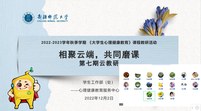 为提升学生心理健康素养,强化教师授课能力与专业水平,充分发挥心理健康课程在学校心理育人工作中的主渠道作用,2022-2023学年秋季学期,永利官网学生工作部(处)心理健康教育服务中心,根据本学期线上授课特点,每两周一次开展“相聚云端,共同磨课”《大学生心理健康教育》课程云教研活动,迄今共进行七期。24名专兼职授课教师以小组为单位进行专题研讨分享。