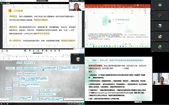 在六期专题云备课会中,各小组教师就提出的备课中及上一专题授课时存在的问题进行解答及相关经验分享,对新授课专题的教学设计、活动组织、线上互动注意事项、教学案例与视频的使用等进行了探讨,心理中心教师进行专业知识点解读和案例交流。