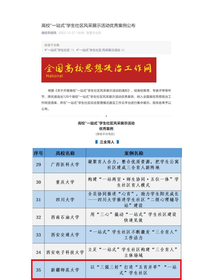 12月27日,经高校推荐、专家评审等环节,教育部共择优遴选出120个高校“一站式”学生社区风采展示活动优秀案例。永利官网以“三强班级”“三好宿舍”创建为载体探索“一站式”学生社区综合管理模式建设,并根据通知要求进一步总结经验、凝练成果,最终推荐的活动成果《以“三强三好”打造“五育并举”“一站式”学生社区》喜获教育部高校“一站式”学生社区风采展示活动“三全育人”类优秀案例,纳入全国高校思想政治工作网资源库,同时在“一站式”学生社区综合管理模式建设工作云平台进行集中展示。