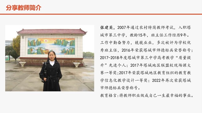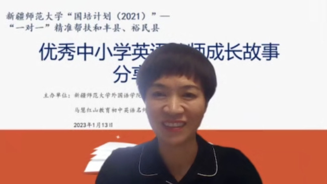 本次分享交流会以“优秀中小学英语教师成长故事”为主题。活动由外国语学院张黎博士主持。分享教师分别为塔城市第3中学教师张建英、乌鲁木齐市第66中学教师陈燕霞、乌鲁木齐市第53中学教师王宏艳和乌鲁木齐市教研中心初中英语教研员、马慧红山教育初中英语名师工作室主持人马慧。