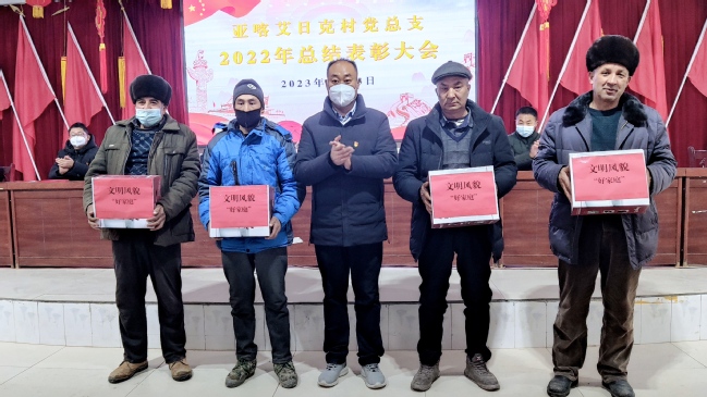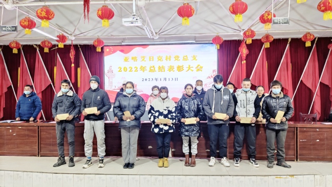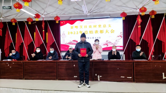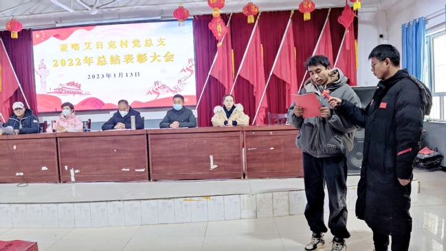 村党支部副书记、村委会主任库尔班·阿尤普宣读了《亚喀艾日克村党总支关于表彰2022年先进集体和个人的决定》,大会对阿布都吾甫尔·阿卜里孜等111人(家庭)进行了表彰和颁奖。