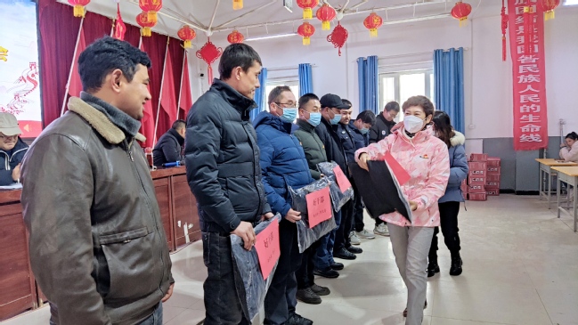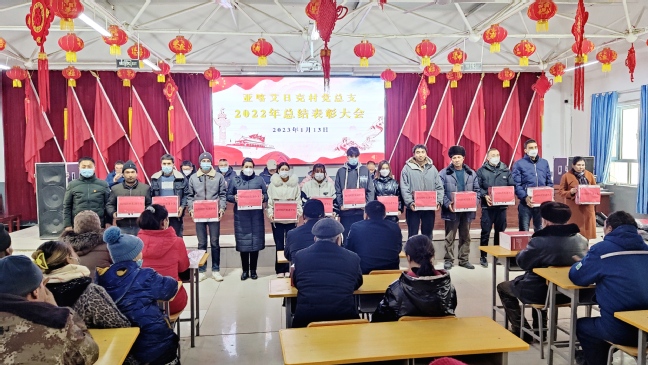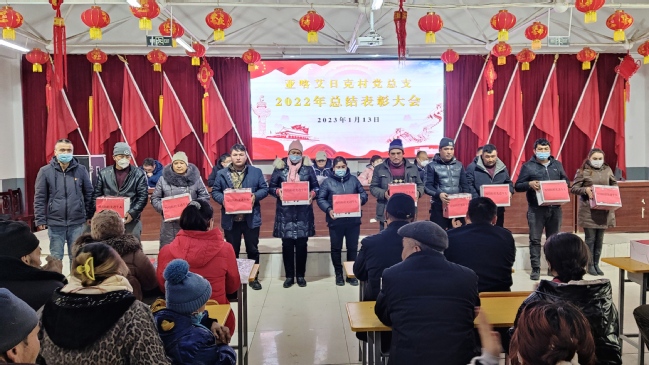 律回春渐,新元肇启。为表彰先进,弘扬社会主义核心价值观,加强乡村精神文明建设,为高质量推进乡村振兴凝聚力量,1月13日下午,亚喀艾日克村党总支召开了2022年工作总结表彰大会。大会总结了过去一年来亚喀艾日克村党总支工作开展情况,表彰了好干部、好家庭、疫情防控先进个人、民族团结先进个人、为民服务先进个人、村务参与先进个人、乡村建设特殊贡献奖等先进集体、先进个人。校党委常委、副校长、驻莎车县前方党工委书记,亚喀艾日克村党总支书记、第一书记孙秀玲出席会议并作总结讲话,亚喀艾日克乡党委书记梁秀超、“访惠聚”工作队全体成员、村两委干部、村民小队长及受表彰的先进集体和个人等150余人参加了会议。会议由亚喀艾日克村党总支副书记、工作队副队长阿不拉·玉素甫主持。