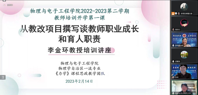 为进一步深化学本科教育教学改革,推动物理学自治区一流专业和校级《力学》课程思政教学团队教育建设,提高本科教育教学质量,2月14日,物理与电子工程学院特邀东北师范大学物理学院党委书记、吉林省教学名师、《物理实验》杂志执行主编李金环教授,向学院全体教师开展了“从教改项目撰写谈教师职业成长和育人职责”专题培训活动。活动由学院党委副书记、院长路俊哲主持,教务处处长孟繁胜及学院全体教师参加活动。