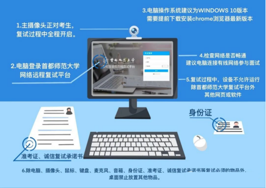(1)考生须提前确定适于复试的封闭、安静的复试场所,室内应保持干净整洁,背景和桌面无杂物,光线充足,除草稿纸和必要的证件外,不得摆放其他物品。房间内除考生本人不能有其他人员。周围环境不得对复试产生干扰。