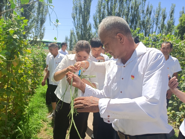 随后,大家乘车前往恰尔巴格乡库特其村,观摩了该村人居环境整治情况和蔬菜种植基地。在豇豆种植基地,当地技术员表示,该村目前种植的豇豆每亩收入可达4000元,并向全体党员认真讲解豇豆种植技术,手把手传授大家如何进行田间管理、栽培、水肥管控等技术,党员们听得十分认真,有的用笔详细记录,有的进行了实地操作,学用结合,为今后持续稳定增收工作奠定了良好的技术保障。