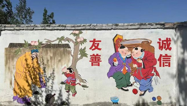 本次墙绘实践活动由美术学院王晓玲教授带领美术学科团队师生经多次赴实地考察和方案论证,为合胜村量身打造了彰显当地特色的墙绘整体策划方案。在美术学院腰进发、靳辉、王晓玲、王俊杰等老师的带领下,41名研究生、本科生共同完成了合胜村620余米主干道的墙绘。