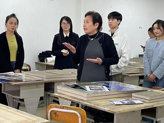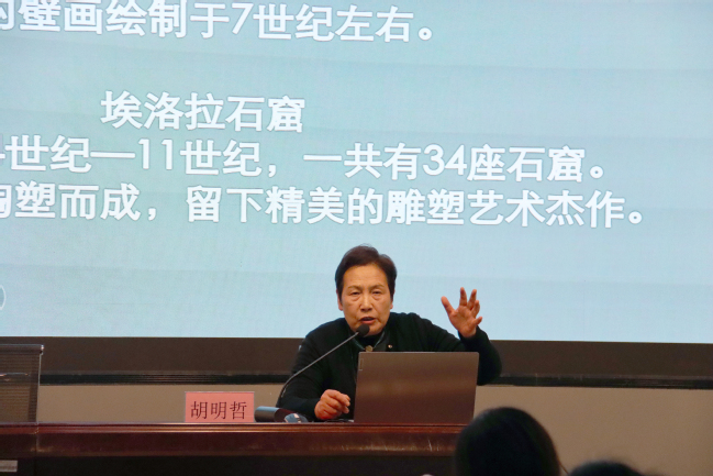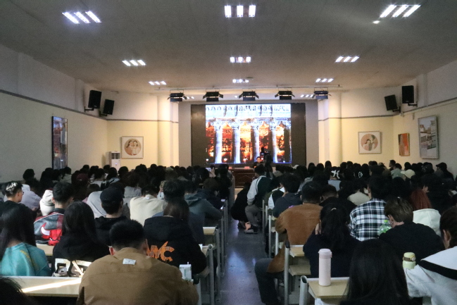 下午,胡明哲教授还为培训学院和美术学院师生作了一场《东方岩彩龟兹面壁》专题学术讲座,用其生动有趣的亲身经历以及一张张实地考察的照片展开知识讲解,使现场师生进一步了解龟兹壁画代表的东方绘画语言特征和语法结构,胡明哲教授还分享了岩彩团队在历史遗存现场的壁画摹写体会。