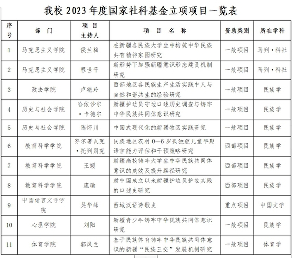 经全国哲学社会科学工作办公室批准,2023年度永利官网共有11项国家社会科学基金项目喜获立项,其中重点项目1项、一般项目7项、西部项目3项,获资助经费235万元。立项项目涉及学科主要有:民族学7项、马列·科社2项、中国文学和体育学各1项。