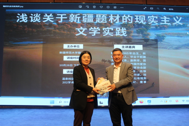 讲座中,鞠利围绕“我对文学的理解”“新疆是文学题材的‘高地’”“我的马克思主义文艺观”“新疆文学的实践”“我的文学实践”等五个方面展开论述,让在座师生对新疆独特的文学素材有了全新的认识和理解。