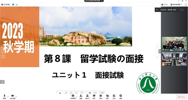 浙江师范大学外国语学院李坤老师以《综合日语》第2册教材中第八课“留学面试”为主要授课内容,将专业知识与实践相结合,通过图片创设情境,使用多种教学方法,在轻松的课堂氛围中传授知识。在语法讲解部分,李坤老师以疫情期间的标语口号引出语法的各个要点,结合生活场景对同学们进行提问,注重专业知识与实践相结合,使同学们能够灵活运用。授课过程中李老师自然融入“西游记”,“2022年杭州亚运会”,“千里江山图”等课程思政元素,巧妙地将语言知识与中国文化元素相结合。两校同学在线上实时交流,课堂气氛积极活跃。