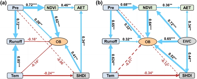 图5. 多因素协同下生态输水工程对生态系统服务综合效益的影响。(a) EWTP实施前的模拟框架,(b) EWTP实施后的模拟框架。Pre代表降水量,NDVI代表归一化植被指数,AET代表实际蒸散量,Tem代表温度,SHDI代表景观多样性指数,OB代表生态系统服务综合效益。EWTP代表生态输水工程。蓝色箭头表示正向影响关系,红色箭头表示负向影响关系,剪切头上的数字表示影响程度,星号表示基于P值的统计显著性水平:“⁎⁎⁎”表示值小于0.01,结果非常显著;“⁎⁎⁎”表示0.01< P 值<0.05,结果相对显著;“⁎⁎”表示0.05< P 值< 0.1,结果不显著。