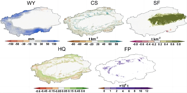 图4. 生态输水工程影响下塔里木河流域生态系统服务的空间差异。WY代表产水量,CS代表固碳量,SF代表防风固沙量,HQ代表栖息地质量,FP代表粮食产量。